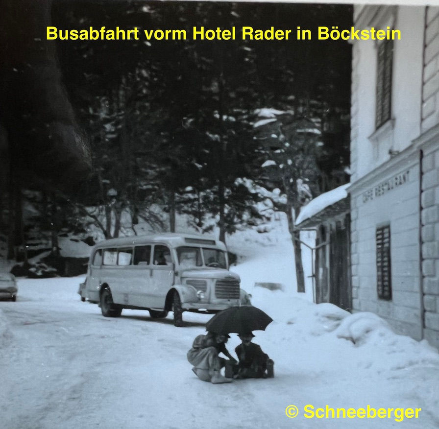 Am Parkplatz beim Hotel beginnt der Wanderweg zur Böckfeldalm. Vor dem Hotel Rader war in den 1950er/1960er Jahren der Standplatz der Kutschen und Fuhrwerke für den Heilstollen. Hier stiegen die Gäste um und wurden vom Kutscher, später dem Busfahrer, zum Gasteiner Heilstollen gebracht. Die moderne Straße, die wir heute Richtung Heilstollen und Sportgastein kennen, wurde zuerst in den 1970er Jahren gebaut. Früher führte die alte Nassfeldstraße Richtung Asten Almen hinein, und ein Stück davor bog man links hoch, wo heute noch ein Weg zur Mautstation zu finden ist. Ein Fuhrunternehmer war Herr Pfeffer, der eine Taxi- und Buskonzession für die entgeltliche Beförderung von Personen hatte, erzählt seine Enkelin Christa. [1]