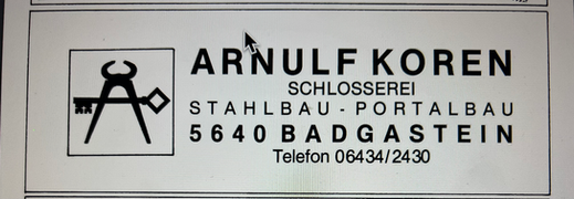 Die ehemalige Adresse war Palfnergraben, und hier befand sich die Schlosserei der Familie Koren. Das Unternehmen wurde im Jahr 1955 von Leopold Koren (*1900†1988 ) gegründet und anschließend von seinem Sohn Arnulf Koren geleitet. Die erste Schlosserei befand sich unten bei der Graberbäckerquelle (die damalige Adresse war Bad Gastein 87 und lag unterhalb des Wasserfalls). Danach wurde das Wohn- und Geschäftshaus hier gebaut. Leopold war mit Helga (*1910 †2005 ) verheiratetet. Viele haben bei Herrn Koren gelernt, unter anderem auch Josef Lugger, bevor er seine eigene Autowerkstatt, Auto Lugger, eröffnete. Arnulf Koren war ein kompetenter Partner für Stahlbau, Portalbau, Alu- und Nirostaverarbeitung sowie Reparaturarbeiten und Schlüsseldienst. Hier lernten beispielsweise auch Peter Brandtner und Peter Lederer, die jetzt ihre eigene Schlosserei, FP-Metall, an der Adresse Palfnerstraße 4 betreiben.[1]